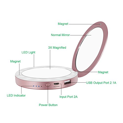 > LED Lighted and Fast Charging --- Bright LED vanity ring light around magnified mirror to allow makeup in the dark, which is controled by the power button. This portable charger battery with 2.1A USB output port and 2A input port, that charges your iphone(iphone cable not included), android and more USB charged devices in a high speed.